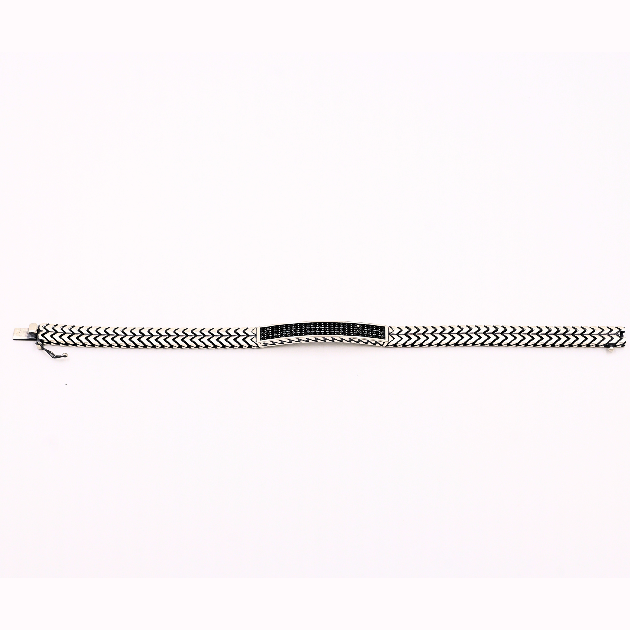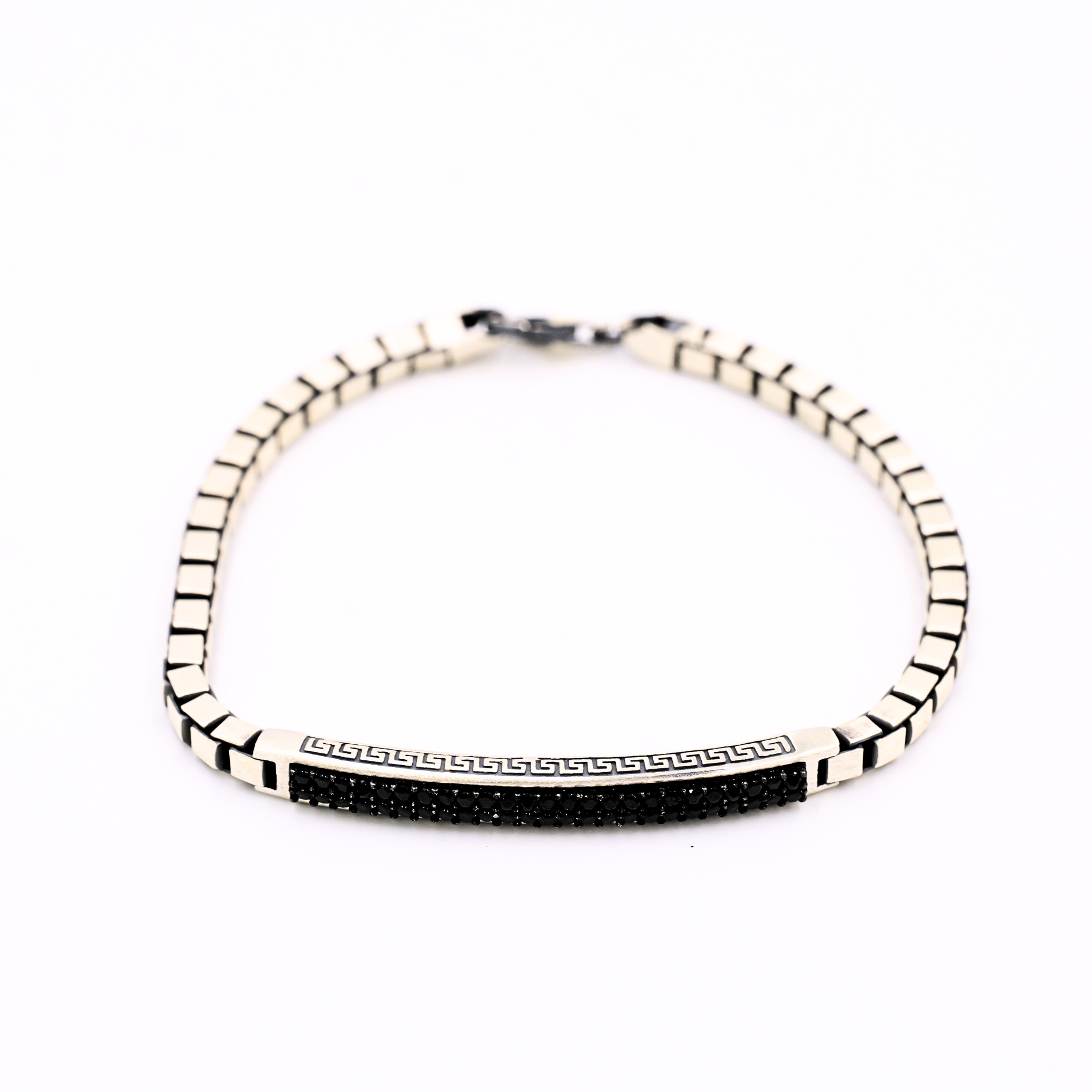 Crafted in premium metal with a sleek silver finish, this bracelet features a bold Greek key–engraved bar accented with deep black stones for a striking contrast. The structured link design offers a modern, masculine appeal while ensuring a comfortable and secure fit. A statement piece that blends classic symbolism with contemporary edge, perfect for everyday wear or elevated styling.
