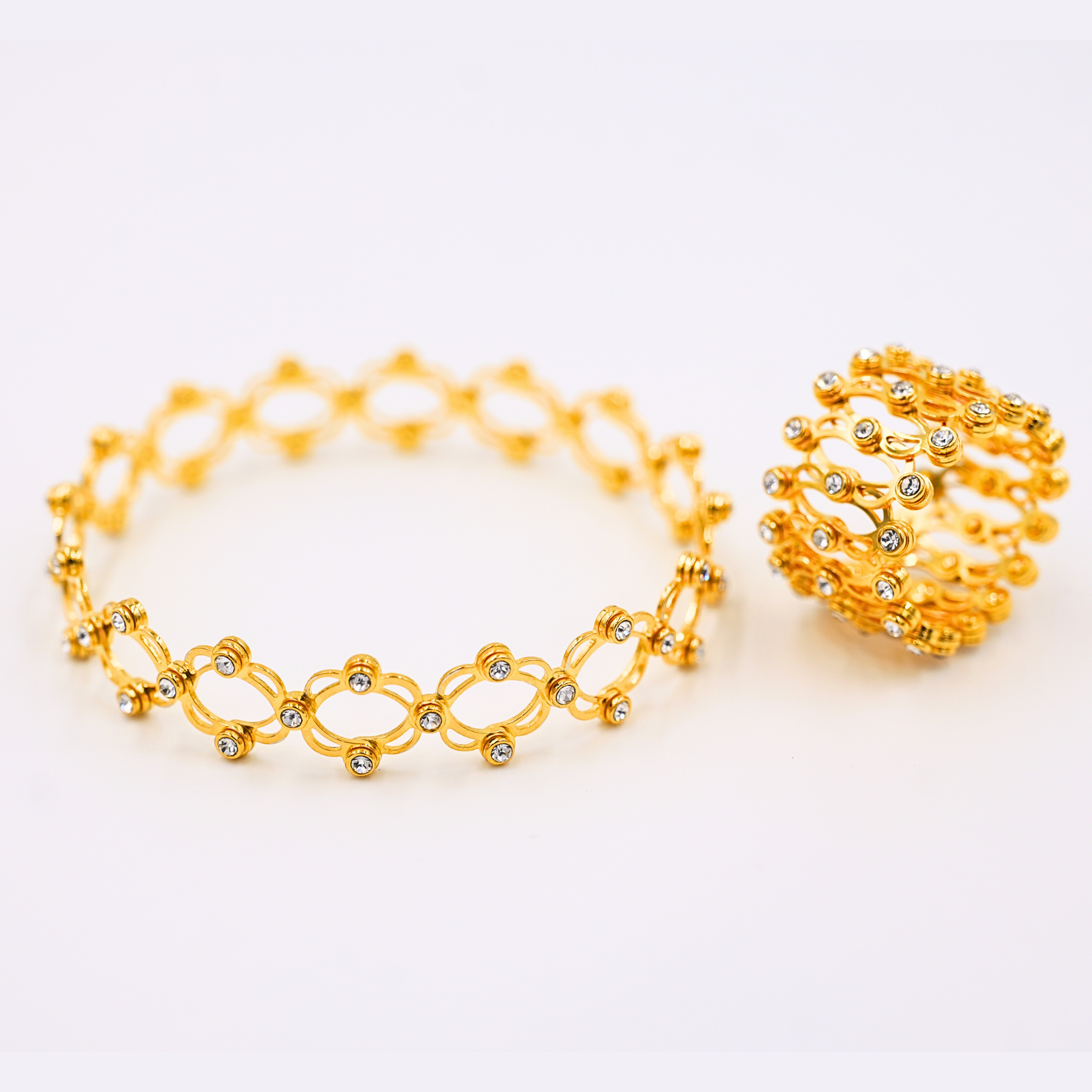Crafted in a radiant gold-tone finish, this elegant convertible piece seamlessly transforms from a statement ring into a delicate bracelet. The intricate open-lattice design is adorned with subtle sparkling accents that catch the light with every movement. Lightweight yet eye-catching, it offers versatile styling—wear it as a bold ring for a modern look or expand it into a graceful bracelet for effortless elegance. Perfect for those who love jewellery that adapts to every mood and moment.