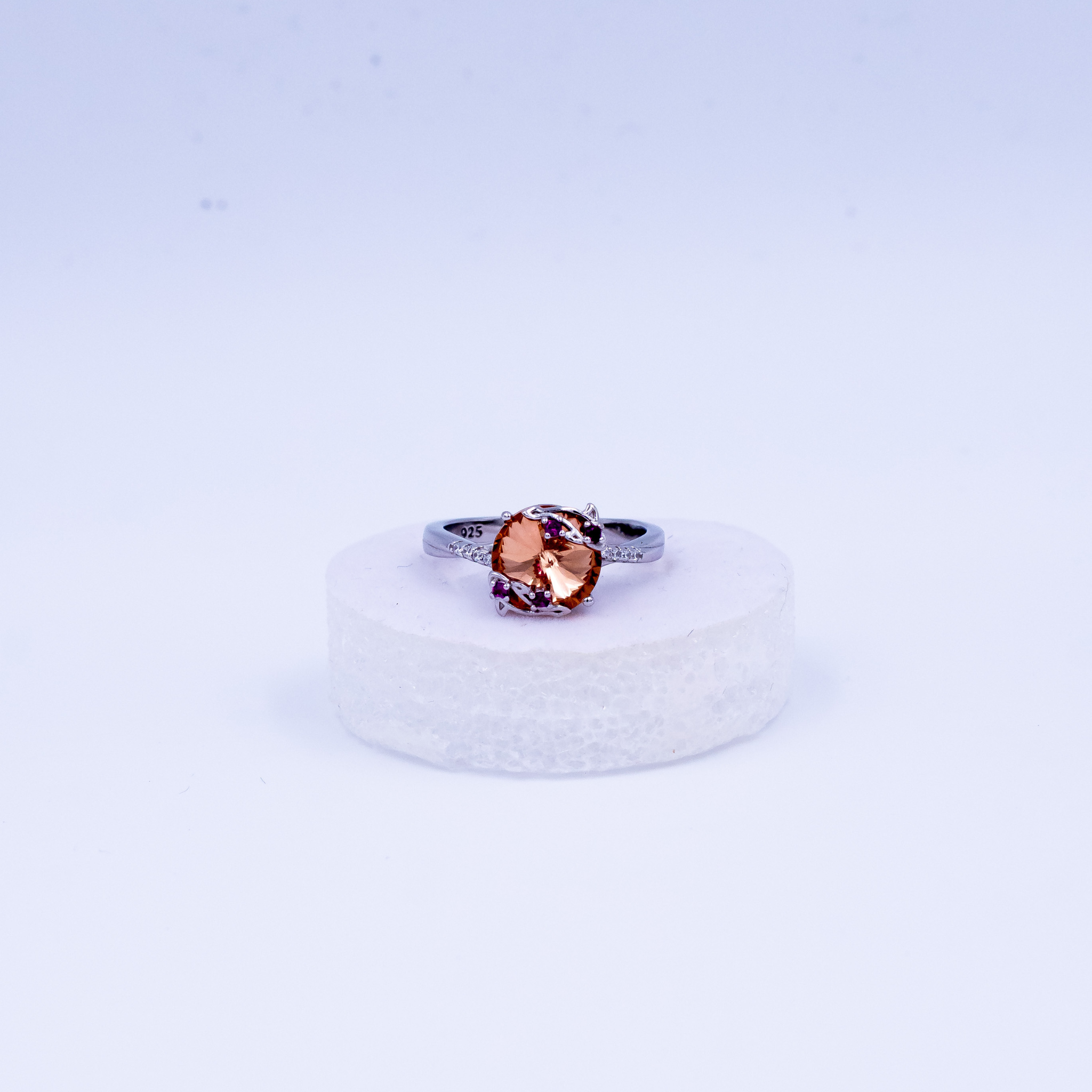 An exclusive statement ring crafted in 92.5 sterling silver, featuring a radiant champagne-gold centre stone embraced by delicate accent stones. The sculpted setting adds depth and elegance, while the refined band ensures a comfortable, graceful fit. Designed to stand out effortlessly, this piece brings a warm glow and luxurious charm to both everyday wear and special occasions.(Ac)